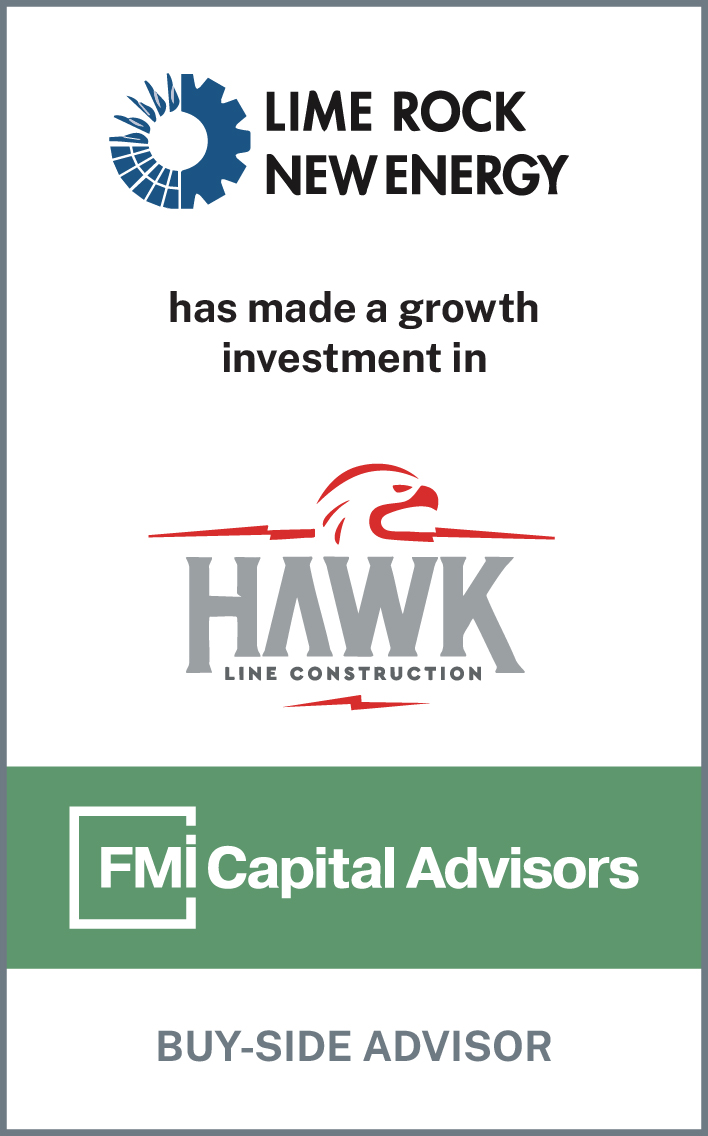 FMI Capital Advisors is pleased to announce that Lime Rock New Energy (LRNE) has made a growth investment in Hawk Line Construction (Hawk), a leading regional specialty utility contractor providing grid infrastructure services. LRNE’s investment will support Hawk’s continued growth, providing both capital and strategic resources to expand its service capabilities and geographic reach. FMI Capital Advisors served as the exclusive financial advisor to Lime Rock New Energy for this transaction.