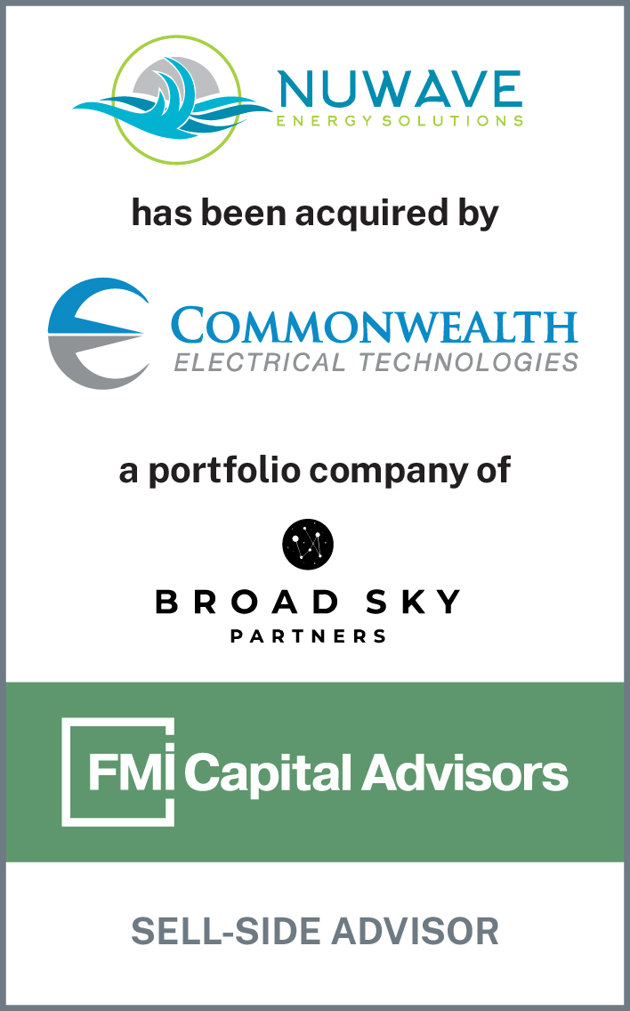 FMI Capital Advisors is pleased to announce that NuWave Energy Solutions (NuWave), a full-service design-build energy efficiency company based in Norwell, Massachusetts, has been acquired by Commonwealth Electrical Technologies (CET), a leading electrical contractor and energy solutions company in the Northeast. This strategic move marks the first transaction for CET under Broad Sky Partners’ ownership, a majority investor since February 2025. FMI Capital Advisors served as the exclusive financial advisor to NuWave for this transaction.