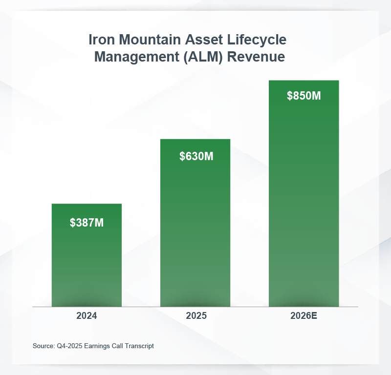 Iron Mountain’s transition from a physical storage player into a diversified ITAD sector leader is accelerating. In its full-year 2025 earnings, the company reported that its Asset Lifecycle Management (ALM) division increased revenue by an astonishing 63%. This is not just a cyclical bump, Iron Mountain is forecasting ALM to become a multi-billion-dollar standalone division. As the data illustrates, the trajectory is staggering. With February 2026 guidance projecting $850 million in ALM revenue for 2026, Iron Mountain is capitalizing on the favorable market environment and its ability to cross-sell ITAD services to its legacy Fortune 1000 storage clients.