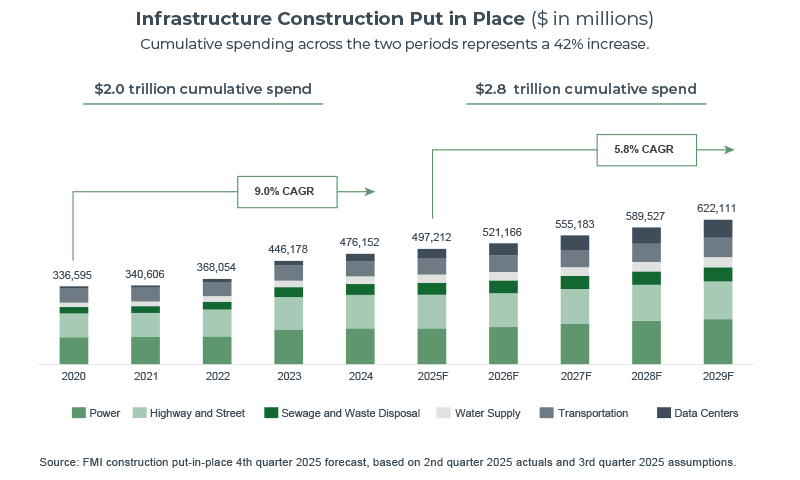 5. Infrastructure investment is fueling multiyear activity. Federal and state programs in transportation, water, wastewater, power and coastal protection are generating long-duration, capital-intensive projects that require significant geotechnical involvement. Infrastructure spending is less sensitive to interest rates and continues even as other segments moderate, providing a durable pipeline of demand.