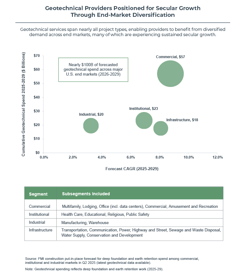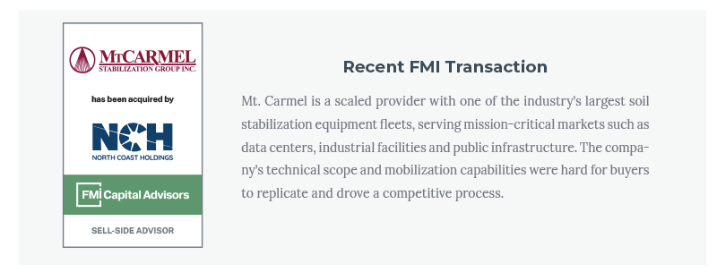 Across FMI’s recent work, one theme is clear: geotechnical providers with strong value-added design and engineering capabilities, specialized fleets and proven execution are becoming some of the most sought-after platforms in the construction ecosystem.