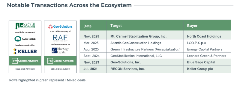 FMI has completed several notable transactions in the geotechnical sector, each underscoring the attributes investors value most. The sector’s consolidation reflects rising structural demand and how difficult it is for others to replicate these specialized differentiated capabilities.